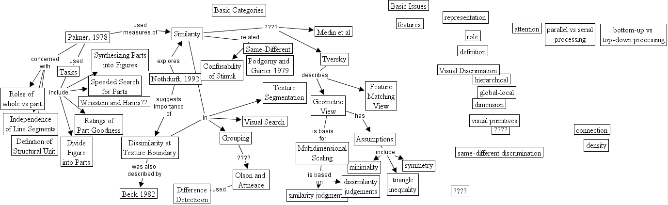 overall map 2, Similarity related to Same-Different, Palmer, 1978 used Tasks, Tasks include Speeded Search for Parts, Olson and Attneace used Difference Detectioon, Nothdurft, 1992 explores Similarity, Tversky describes Feature Matching View, Similarity in Texture Segmentation, Tversky describes Geometric View, Similarity ???? Tversky, Nothdurft, 1992 suggests importance of Dissimilarity at Texture Boundary