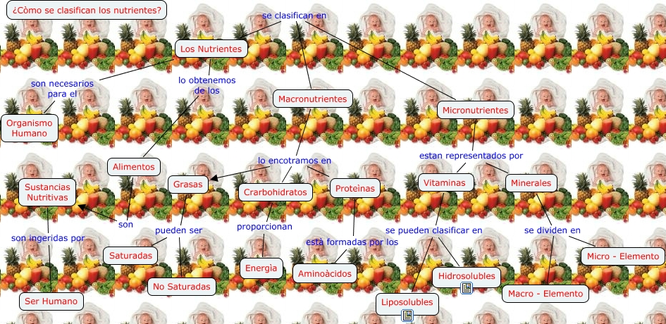 Los Nutrientes, Los Nutrientes se clasifican en Micronutrientes, Minerales se dividen en Micro - Elemento, Macronutrientes lo encotramos en Proteìnas, Proteìnas està formadas por los Aminoàcidos, Grasas pueden ser Saturadas, Sustancias Nutritivas son ingeridas por Ser Humano, Alimentos son Sustancias Nutritivas, Los Nutrientes lo obtenemos de los Alimentos, Minerales se dividen en Macro - Elemento, Los Nutrientes son necesarios para el Organismo Humano