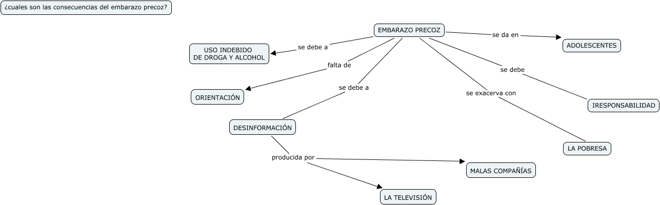 embarazo precoz, EMBARAZO PRECOZ se debe a USO INDEBIDO DE DROGA Y ALCOHOL, EMBARAZO PRECOZ se debe a DESINFORMACIÓN, EMBARAZO PRECOZ se da en ADOLESCENTES, DESINFORMACIÓN producida por LA TELEVISIÓN, DESINFORMACIÓN producida por MALAS COMPAÑ�?AS, EMBARAZO PRECOZ se debe IRESPONSABILIDAD, EMBARAZO PRECOZ se exacerva con LA POBRESA, EMBARAZO PRECOZ falta de ORIENTACIÓN