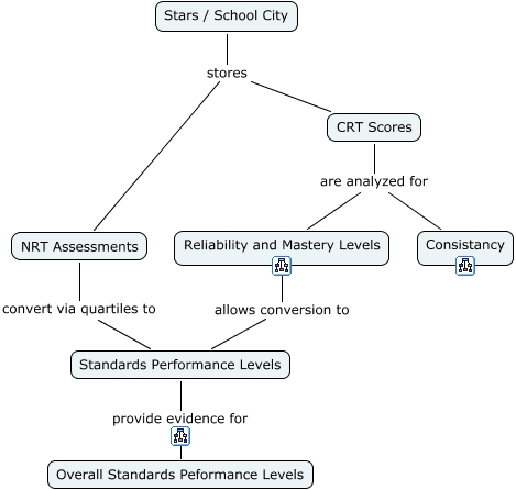 Assessments to Overall Performance, CRT Scores are analyzed for Consistancy, Stars / School City stores CRT Scores, CRT Scores are analyzed for Reliability and Mastery Levels, Stars / School City stores NRT Assessments, NRT Assessments convert via quartiles to Standards Performance Levels, Standards Performance Levels provide evidence for Overall Standards Peformance Levels, Reliability and Mastery Levels allows conversion to Standards Performance Levels