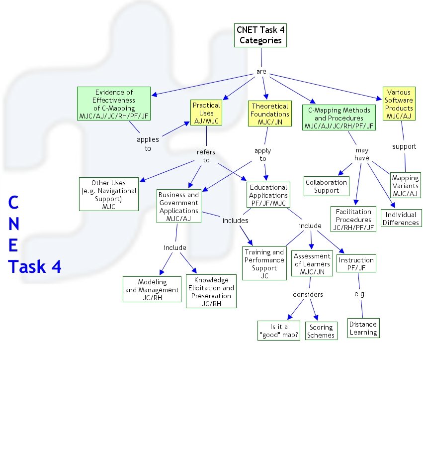 CategoriesFinal, Business and Government Applications MJC/AJ include Modeling and Management JC/RH, Assessment of Learners MJC/JN considers Is it a "good" map?, CNET Task 4 Categories are Theoretical Foundations MJC/JN, Practical Uses AJ/MJC refers to Educational Applications PF/JF/MJC, C-Mapping Methods and Procedures MJC/AJ/JC/RH/PF/JF may have Collaboration Support, Practical Uses AJ/MJC refers to Business and Government Applications MJC/AJ, Instruction PF/JF e.g. Distance Learning, Evidence of Effectiveness of C-Mapping MJC/AJ/JC/RH/PF/JF applies to Practical Uses AJ/MJC, C-Mapping Methods and Procedures MJC/AJ/JC/RH/PF/JF may have Facilitation Procedures JC/RH/PF/JF, Training and Performance Support JC include Instruction PF/JF