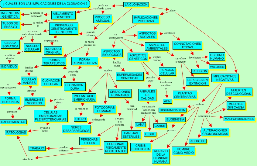la clonacion, CREACIONES HUMNANAS dara felicidad PAREJAS ESTERILES, FORMA TERAPEUTICS implica obtener CELULAS MADRES, IMPLICACIONES NEGATIVAS se refiere a MUERTES DESCONOCIDAS, FORMA REPRODUCTIVA conocida como CLONACION CELULAR, INDIVIDUOS GENETICAMENTE IDENTICOS se parecen al INDIVIDUO ORIGINAL, IMPLICACIONES POSITIVAS se enmarcan en ASPECTOS AMBIENTALES, FORMA TERAPEUTICS conocida como CLONACION CELULAR, IMPLANTACIO EMBRIONARIA se realiza en UTERO, ANIMALES DE CALIDAD en clonacio ´son los que producen mas LANA, IMPLICACIONES NEGATIVAS se refiere a ABORTOS