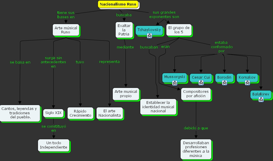 Nacionalismo Ruso tiene sus bases en Arte m�sical Ruso, Arte m�sical Ruso tuvo R�pido Crecimiento, Arte m�sical Ruso se basa en Cantos, leyendas y tradiciones del pueblo., Nacionalismo Ruso buscaba Exaltar la Patria, Arte m�sical Ruso surge sin antecedentes en Siglo XIX, Arte m�sical Ruso representa El arte Nacionalista, El grupo de los 5 buscaban Establecer la identidad musical nacional, Siglo XIX se constituy� en Un todo Independiente, El grupo de los 5 eran Compositores por afici�n, Exaltar la Patria mediante Arte musical propio, Nacionalismo Ruso sus grandes exponentes son El grupo de los 5, Nacionalismo Ruso sus grandes exponentes son Tchaykovsky, Compositores por afici�n debido a que Desarrollaban profesiones diferentes a la m�sica, El grupo de los 5 estaba conformado por Borodin, El grupo de los 5 estaba conformado por Balakirev, El grupo de los 5 estaba conformado por Cesar Cui, El grupo de los 5 estaba conformado por Mussorgski, El grupo de los 5 estaba conformado por Korsakov