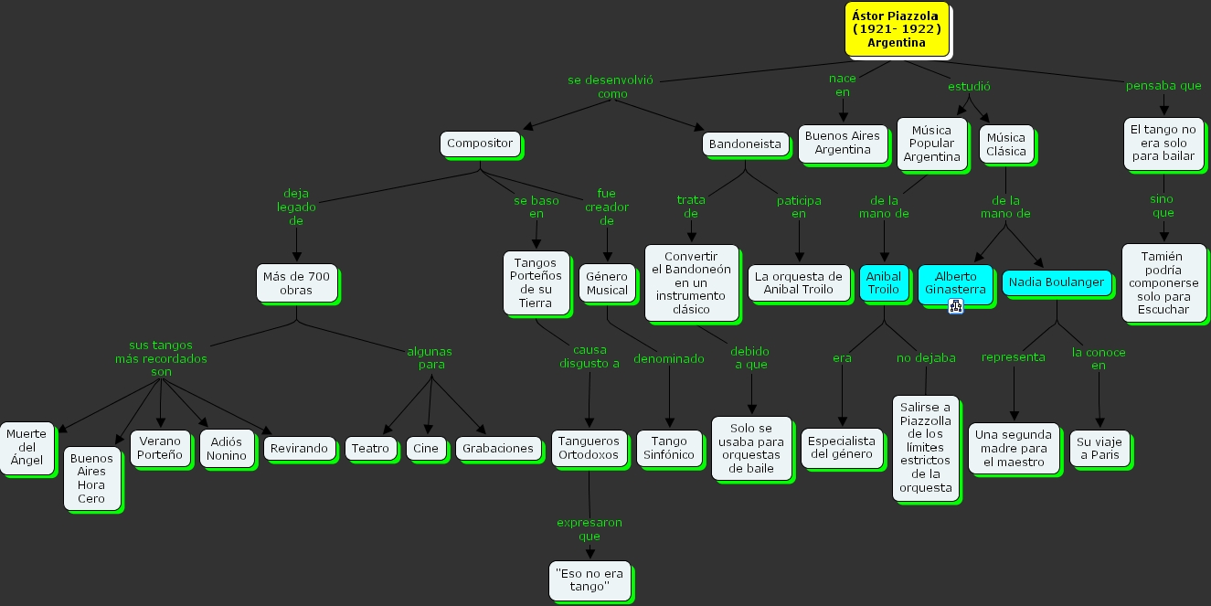 G�nero Musical denominado Tango Sinf�nico, M�sica Cl�sica de la mano de Alberto Ginasterra, M�sica Cl�sica de la mano de Nadia Boulanger, Nadia Boulanger representa Una segunda madre para el maestro, Compositor fue creador de G�nero Musical, Bandoneista trata de Convertir el Bandone�n en un instrumento cl�sico, Compositor deja legado de M�s de 700 obras, M�s de 700 obras algunas para Cine, M�s de 700 obras algunas para Grabaciones, M�s de 700 obras algunas para Teatro, Anibal Troilo era Especialista del g�nero, Convertir el Bandone�n en un instrumento cl�sico debido a que Solo se usaba para orquestas de baile, M�s de 700 obras sus tangos m�s recordados son Adi�s Nonino, M�s de 700 obras sus tangos m�s recordados son Buenos Aires Hora Cero, M�s de 700 obras sus tangos m�s recordados son Revirando, M�s de 700 obras sus tangos m�s recordados son Muerte del �ngel, M�s de 700 obras sus tangos m�s recordados son Verano Porte�o, Tangos Porte�os de su Tierra causa disgusto a Tangueros Ortodoxos, Anibal Troilo no dejaba Salirse a Piazzolla de los l�mites estrictos de la orquesta, �stor Piazzola (1921- 1922) Argentina estudi� M�sica Popular Argentina, �stor Piazzola (1921- 1922) Argentina estudi� M�sica Cl�sica, Tangueros Ortodoxos expresaron que "Eso no era tango", Nadia Boulanger la conoce en Su viaje a Paris, Compositor se baso en Tangos Porte�os de su Tierra, El tango no era solo para bailar sino que Tami�n podr�a componerse solo para Escuchar, �stor Piazzola (1921- 1922) Argentina nace en Buenos Aires Argentina, M�sica Popular Argentina de la mano de Anibal Troilo, Bandoneista paticipa en La orquesta de Anibal Troilo, �stor Piazzola (1921- 1922) Argentina se desenvolvi� como Bandoneista, �stor Piazzola (1921- 1922) Argentina se desenvolvi� como Compositor, �stor Piazzola (1921- 1922) Argentina pensaba que El tango no era solo para bailar