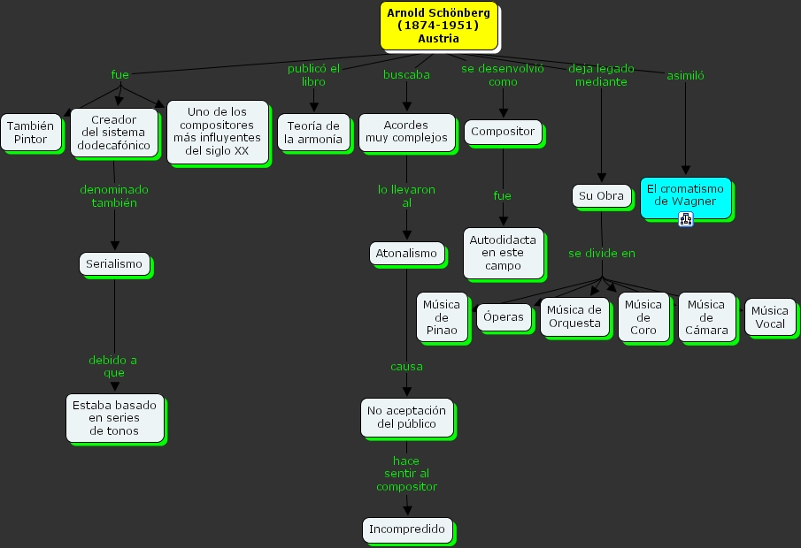 Arnold Sch�nberg (1874-1951) Austria fue Creador del sistema dodecaf�nico, Arnold Sch�nberg (1874-1951) Austria fue Uno de los compositores m�s influyentes del siglo XX, Arnold Sch�nberg (1874-1951) Austria fue Tambi�n Pintor, Atonalismo causa No aceptaci�n del p�blico, Arnold Sch�nberg (1874-1951) Austria buscaba Acordes muy complejos, Arnold Sch�nberg (1874-1951) Austria asimil� El cromatismo de Wagner, Arnold Sch�nberg (1874-1951) Austria deja legado mediante Su Obra, Compositor fue Autodidacta en este campo, Arnold Sch�nberg (1874-1951) Austria public� el libro Teor�a de la armon�a, Creador del sistema dodecaf�nico denominado tambi�n Serialismo, Serialismo debido a que Estaba basado en series de tonos, Su Obra se divide en M�sica Vocal, Su Obra se divide en �peras, Su Obra se divide en M�sica de Coro, Su Obra se divide en M�sica de Orquesta, Su Obra se divide en M�sica de C�mara, Su Obra se divide en M�sica de Pinao, No aceptaci�n del p�blico hace sentir al compositor Incompredido, Acordes muy complejos lo llevaron al Atonalismo, Arnold Sch�nberg (1874-1951) Austria se desenvolvi� como Compositor