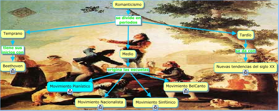 mapa principal Romanticismo, Romanticismo se divide en periodos Medio, Medio origina las escuelas Movimiento Nacionalista, Romanticismo se divide en periodos Temprano, Tardío se da con Nuevas tendencias del siglo XX, Temprano tiene sus inicios con Beethoven, Medio origina las escuelas Movimiento Pianístico, Medio origina las escuelas Movimiento Sinfónico, Romanticismo se divide en periodos Tardío, Medio origina las escuelas Movimiento BelCanto