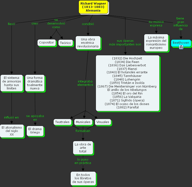 Richard Wagner (1813-1883) Alemania su m�sica expresa La m�xima expresi�n del romanticismo europeo, Richard Wagner (1813-1883) Alemania tiene gran influencia de Beethoven, Una obra esc�nica revolucionaria integraba elementos Visuales, Una obra esc�nica revolucionaria integraba elementos Teatrales, Una obra esc�nica revolucionaria integraba elementos Musicales, Richard Wagner (1813-1883) Alemania llev� El sistema de armon�as hasta sus l�mites, Visuales formaban La obra de arte total, Richard Wagner (1813-1883) Alemania sus �peras m�s importantes son (1832) Die Hochzeit (1834) Die Feen (1836) Das Liebesverbot (1837) Rienzi (1843) El holand�s errante (1845) Tannh�user (1848) Lohengrin (1859) Trist�n e Isolda (1867) Die Meistersinger von N�rnberg El anillo de los nibelungos (1854) El oro del Rin (1856) La Valquiria (1871) Sigfrido (�pera) (1874) El ocaso de los dioses (1882) Parsifal, Richard Wagner (1813-1883) Alemania se desenvolvi� como Copositor, Richard Wagner (1813-1883) Alemania se desenvolvi� como Te�rico, La obra de arte total lo puso en pr�ctica En todos los libretos de sus �peras, El sistema de armon�as hasta sus l�mites influy� en El atonalismo del siglo XX, Musicales formaban La obra de arte total, Una forma dram�tica toalmente nueva se apoyaba en El drama Griego, Richard Wagner (1813-1883) Alemania concibi� Una obra esc�nica revolucionaria, Teatrales formaban La obra de arte total, Richard Wagner (1813-1883) Alemania creo Una forma dram�tica toalmente nueva