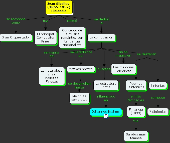 La composici�n se caracteriza por Motivos breves, Jean Sibelius (1865-1957) Finlandia se dedic� a La composici�n, La composici�n no se inspira en Las melod�as Folcl�ricas, La composici�n se inspira en La naturaleza y las bellezas Finesas, Finlandia (1899) fue Su obra m�s famosa, Jean Sibelius (1865-1957) Finlandia reflej� Concepto de la m�sica rom�ntica con tendencia Nacionalista, Jean Sibelius (1865-1957) Finlandia se reconoce como Gran Orquestador, Motivos breves se desarrollan hasta Melodias completas, Jean Sibelius (1865-1957) Finlandia fue El principal Compositor Fin�s, La composici�n se destacan Poemas sinf�nicos, La composici�n se destacan Sinfon�as, Poemas sinf�nicos el m�s famoso es Finlandia (1899), La composici�n buscaba La estructura Formal, La estructura Formal influenciado en Johannes Brahms, Sinfon�as compuso 7 Sinfon�as