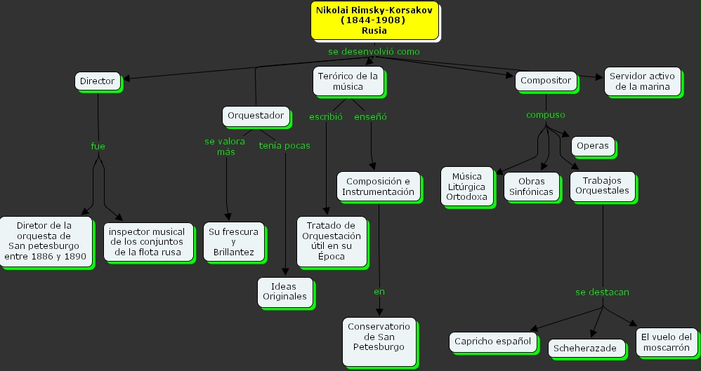 Nikolai Rimsky-Korsakov (1844-1908) Rusia se desenvolvi� como Compositor, Nikolai Rimsky-Korsakov (1844-1908) Rusia se desenvolvi� como Director, Nikolai Rimsky-Korsakov (1844-1908) Rusia se desenvolvi� como Orquestador, Nikolai Rimsky-Korsakov (1844-1908) Rusia se desenvolvi� como Ter�rico de la m�sica, Nikolai Rimsky-Korsakov (1844-1908) Rusia se desenvolvi� como Servidor activo de la marina, Orquestador se valora m�s Su frescura y Brillantez, Composici�n e Instrumentaci�n en Conservatorio de San Petesburgo , Compositor compuso Obras Sinf�nicas, Compositor compuso Trabajos Orquestales, Compositor compuso M�sica Lit�rgica Ortodoxa, Compositor compuso Operas, Ter�rico de la m�sica escribi� Tratado de Orquestaci�n �til en su �poca, Ter�rico de la m�sica ense�� Composici�n e Instrumentaci�n, Orquestador ten�a pocas Ideas Originales, Director fue Diretor de la orquesta de San petesburgo entre 1886 y 1890, Director fue inspector musical de los conjuntos de la flota rusa, Trabajos Orquestales se destacan El vuelo del moscarr�n, Trabajos Orquestales se destacan Capricho espa�ol, Trabajos Orquestales se destacan Scheherazade