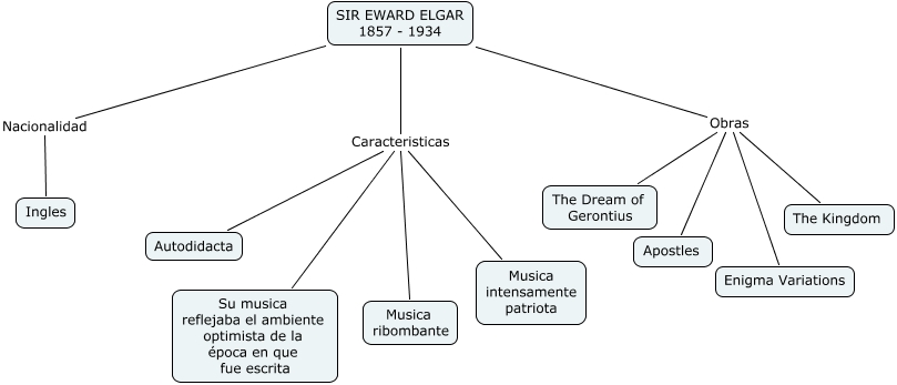 Elgar, SIR EWARD ELGAR 1857 - 1934 Nacionalidad Ingles, SIR EWARD ELGAR 1857 - 1934 Caracteristicas Autodidacta, SIR EWARD ELGAR 1857 - 1934 Obras The Kingdom, SIR EWARD ELGAR 1857 - 1934 Obras Enigma Variations, SIR EWARD ELGAR 1857 - 1934 Obras The Dream of Gerontius, SIR EWARD ELGAR 1857 - 1934 Caracteristicas Musica intensamente patriota, SIR EWARD ELGAR 1857 - 1934 Caracteristicas Musica ribombante, SIR EWARD ELGAR 1857 - 1934 Caracteristicas Su musica reflejaba el ambiente optimista de la época en que fue escrita, SIR EWARD ELGAR 1857 - 1934 Obras Apostles