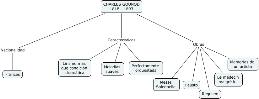 Gounod, CHARLES GOUNOD 1818 - 1893 Obras Fausto, CHARLES GOUNOD 1818 - 1893 Obras Messe Solennelle, CHARLES GOUNOD 1818 - 1893 Caracteristicas Perfectamente orquestada, CHARLES GOUNOD 1818 - 1893 Caracteristicas Melodías suaves, CHARLES GOUNOD 1818 - 1893 Obras Le médecin malgré lui, CHARLES GOUNOD 1818 - 1893 Caracteristicas Lirismo más que condición dramática, CHARLES GOUNOD 1818 - 1893 Obras Requiem, CHARLES GOUNOD 1818 - 1893 Nacionalidad Frances, CHARLES GOUNOD 1818 - 1893 Obras Memorias de un artista