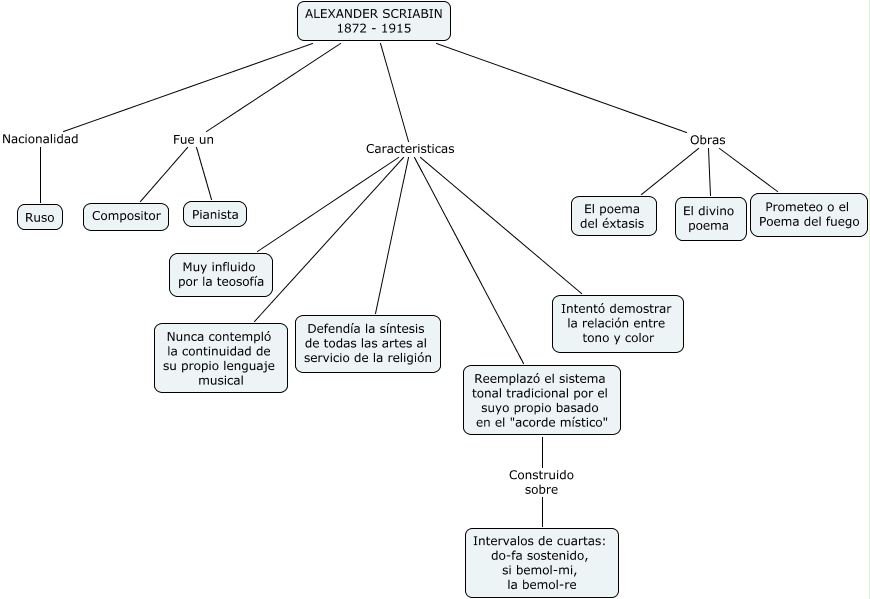 Scriabin, ALEXANDER SCRIABIN 1872 - 1915 Caracteristicas Muy influido por la teosofía, ALEXANDER SCRIABIN 1872 - 1915 Obras Prometeo o el Poema del fuego, ALEXANDER SCRIABIN 1872 - 1915 Fue un Compositor, Reemplazó el sistema tonal tradicional por el suyo propio basado en el "acorde místico" Construido sobre Intervalos de cuartas: do-fa sostenido, si bemol-mi, la bemol-re, ALEXANDER SCRIABIN 1872 - 1915 Fue un Pianista, ALEXANDER SCRIABIN 1872 - 1915 Obras El divino poema, ALEXANDER SCRIABIN 1872 - 1915 Caracteristicas Intentó demostrar la relación entre tono y color, ALEXANDER SCRIABIN 1872 - 1915 Nacionalidad Ruso, ALEXANDER SCRIABIN 1872 - 1915 Obras El poema del éxtasis, ALEXANDER SCRIABIN 1872 - 1915 Caracteristicas Reemplazó el sistema tonal tradicional por el suyo propio basado en el "acorde místico"