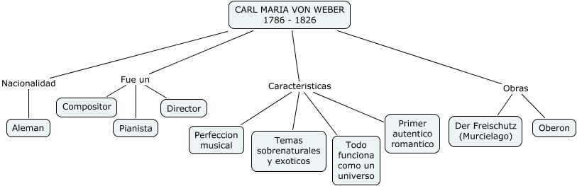 Weber, CARL MARIA VON WEBER 1786 - 1826 Fue un Director, CARL MARIA VON WEBER 1786 - 1826 Fue un Compositor, CARL MARIA VON WEBER 1786 - 1826 Caracteristicas Perfeccion musical, CARL MARIA VON WEBER 1786 - 1826 Obras Der Freischutz (Murcielago), CARL MARIA VON WEBER 1786 - 1826 Caracteristicas Temas sobrenaturales y exoticos, CARL MARIA VON WEBER 1786 - 1826 Obras Oberon, CARL MARIA VON WEBER 1786 - 1826 Caracteristicas Primer autentico romantico, CARL MARIA VON WEBER 1786 - 1826 Nacionalidad Aleman, CARL MARIA VON WEBER 1786 - 1826 Fue un Pianista, CARL MARIA VON WEBER 1786 - 1826 Caracteristicas Todo funciona como un universo