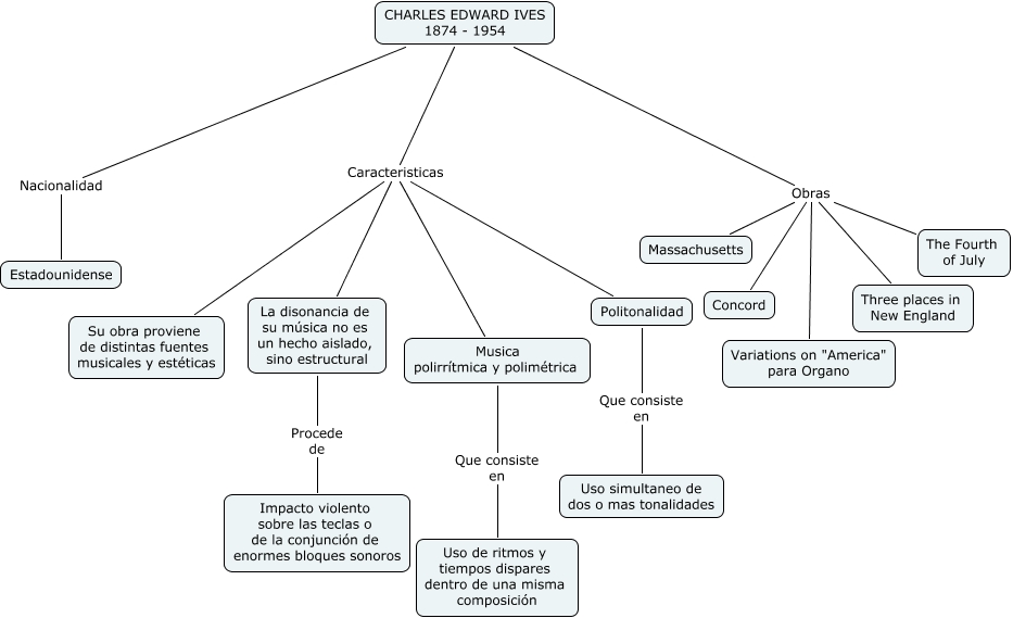Ives, CHARLES EDWARD IVES 1874 - 1954 Nacionalidad Estadounidense, CHARLES EDWARD IVES 1874 - 1954 Obras Massachusetts, CHARLES EDWARD IVES 1874 - 1954 Obras Variations on "America" para Organo, CHARLES EDWARD IVES 1874 - 1954 Obras Three places in New England, CHARLES EDWARD IVES 1874 - 1954 Caracteristicas Musica polirrítmica y polimétrica, CHARLES EDWARD IVES 1874 - 1954 Caracteristicas Su obra proviene de distintas fuentes musicales y estéticas, CHARLES EDWARD IVES 1874 - 1954 Obras The Fourth of July, La disonancia de su música no es un hecho aislado, sino estructural Procede de Impacto violento sobre las teclas o de la conjunción de enormes bloques sonoros, CHARLES EDWARD IVES 1874 - 1954 Caracteristicas Politonalidad, CHARLES EDWARD IVES 1874 - 1954 Caracteristicas La disonancia de su música no es un hecho aislado, sino estructural