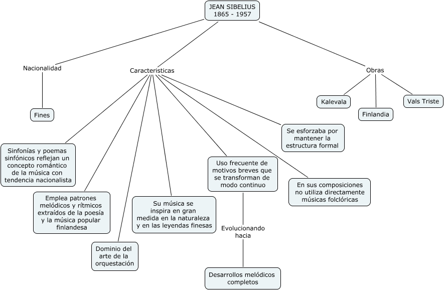 Sibelius, JEAN SIBELIUS 1865 - 1957 Caracteristicas Su música se inspira en gran medida en la naturaleza y en las leyendas finesas, JEAN SIBELIUS 1865 - 1957 Obras Finlandia, JEAN SIBELIUS 1865 - 1957 Caracteristicas En sus composiciones no utiliza directamente músicas folclóricas, JEAN SIBELIUS 1865 - 1957 Caracteristicas Uso frecuente de motivos breves que se transforman de modo continuo, JEAN SIBELIUS 1865 - 1957 Caracteristicas Emplea patrones melódicos y rítmicos extraídos de la poesía y la música popular finlandesa, JEAN SIBELIUS 1865 - 1957 Caracteristicas Sinfonías y poemas sinfónicos reflejan un concepto romántico de la música con tendencia nacionalista, JEAN SIBELIUS 1865 - 1957 Nacionalidad Fines, JEAN SIBELIUS 1865 - 1957 Obras Vals Triste, JEAN SIBELIUS 1865 - 1957 Caracteristicas Se esforzaba por mantener la estructura formal, JEAN SIBELIUS 1865 - 1957 Obras Kalevala