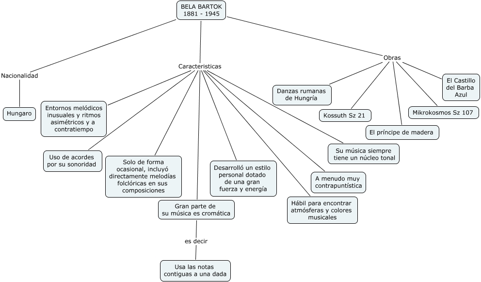 Bartok, BELA BARTOK 1881 - 1945 Obras Kossuth Sz 21, BELA BARTOK 1881 - 1945 Obras El príncipe de madera, Gran parte de su música es cromática es decir Usa las notas contiguas a una dada, BELA BARTOK 1881 - 1945 Obras Danzas rumanas de Hungría, BELA BARTOK 1881 - 1945 Obras Mikrokosmos Sz 107, BELA BARTOK 1881 - 1945 Caracteristicas Entornos melódicos inusuales y ritmos asimétricos y a contratiempo, BELA BARTOK 1881 - 1945 Caracteristicas Uso de acordes por su sonoridad, BELA BARTOK 1881 - 1945 Caracteristicas Hábil para encontrar atmósferas y colores musicales, BELA BARTOK 1881 - 1945 Caracteristicas Desarrolló un estilo personal dotado de una gran fuerza y energía, BELA BARTOK 1881 - 1945 Caracteristicas Su música siempre tiene un núcleo tonal