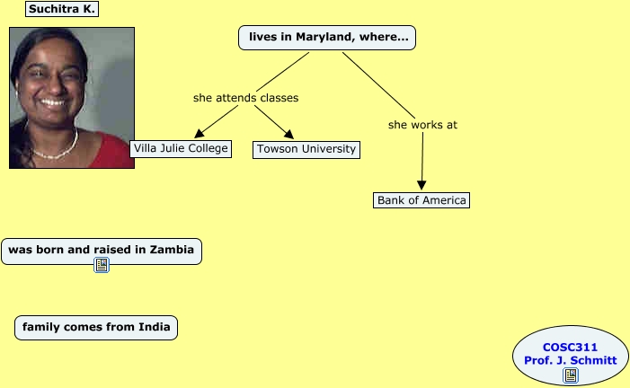 Suchitra's cmap, lives in Maryland, where... she attends classes Villa Julie College, lives in Maryland, where... she works at Bank of America, lives in Maryland, where... she attends classes Towson University