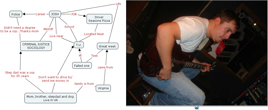 Josh's Cmap, JOSH MAJOR CRIMINAL JUSTICE SOCIOLOGY, Great week Test Failed one, JOSH JOB Driver Seasons Pizza, JOSH School T.U., Failed one at T.U., JOSH Live near T.U., Mom, brother, stepdad and dog Live in VA Step dad was a cop for 35 years CRIMINAL JUSTICE SOCIOLOGY, JOSH Career Police, JOSH MAJOR CRIMINAL JUSTICE SOCIOLOGY, Driver Seasons Pizza Located Near T.U.