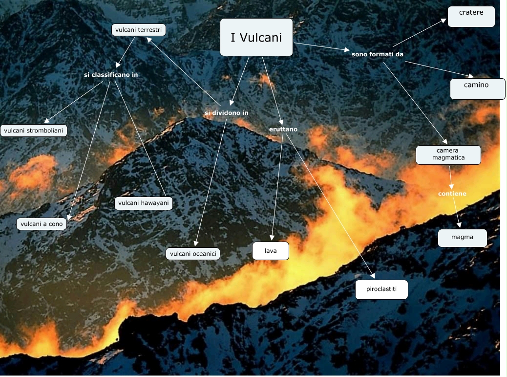 vulcani in generale, vulcani terrestri si classificano in vulcani stromboliani, vulcani terrestri si classificano in vulcani hawayani, vulcani terrestri si classificano in vulcani a cono, camera magmatica contiene magma, I Vulcani eruttano lava, I Vulcani sono formati da camera magmatica, I Vulcani si dividono in vulcani terrestri, I Vulcani sono formati da cratere, I Vulcani sono formati da camino, I Vulcani si dividono in vulcani oceanici