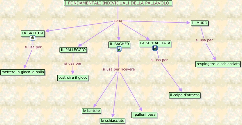 This Concept Map, created with IHMC CmapTools, has information related to: Fondamentali individuali pallavolo, I FONDAMENTALI INDIVIDUALI DELLA PALLAVOLO sono IL BAGHER, IL BAGHER si usa per ricevere i palloni bassi, LA BATTUTA si usa per mettere in gioco la palla, I FONDAMENTALI INDIVIDUALI DELLA PALLAVOLO sono IL MURO, I FONDAMENTALI INDIVIDUALI DELLA PALLAVOLO sono IL PALLEGGIO, IL MURO si usa per respingere la schiacciata, LA SCHIACCIATA si usa per il colpo d'attacco, IL BAGHER si usa per ricevere le battute, IL PALLEGGIO si usa per costruire il gioco, I FONDAMENTALI INDIVIDUALI DELLA PALLAVOLO sono LA SCHIACCIATA, IL BAGHER si usa per ricevere le schiacciate, I FONDAMENTALI INDIVIDUALI DELLA PALLAVOLO sono LA BATTUTA