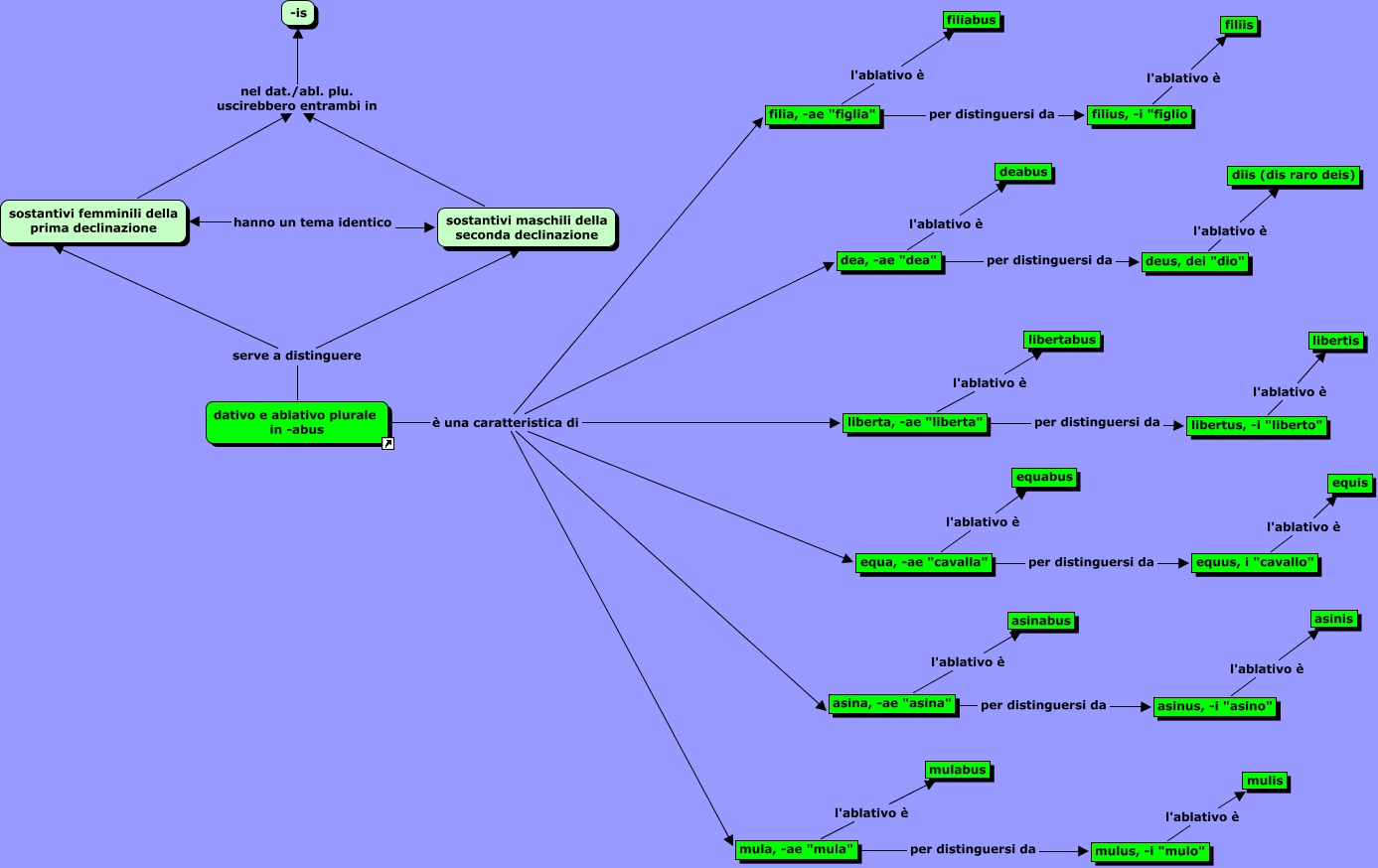 Particolarità del caso della prima declinazione - Dat.-abl. in -abus, dativo e ablativo plurale in -abus serve a distinguere sostantivi maschili della seconda declinazione, asina, -ae "asina" per distinguersi da asinus, -i "asino", dativo e ablativo plurale in -abus è una caratteristica di liberta, -ae "liberta", dativo e ablativo plurale in -abus è una caratteristica di dea, -ae "dea", deus, dei "dio" l'ablativo è diis (dis raro deis), mulus, -i "mulo" l'ablativo è mulis, sostantivi femminili della prima declinazione nel dat./abl. plu. uscirebbero entrambi in -is, dea, -ae "dea" per distinguersi da deus, dei "dio", equus, i "cavallo" l'ablativo è equis, filia, -ae "figlia" per distinguersi da filius, -i "figlio