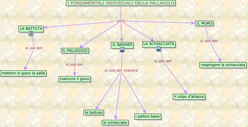Questa Cmap, creata con IHMC CmapTools, contiene informazioni relative a: Fondamentali individuali pallavolo, I FONDAMENTALI INDIVIDUALI DELLA PALLAVOLO sono IL BAGHER, IL BAGHER si usa per ricevere i palloni bassi, LA BATTUTA si usa per mettere in gioco la palla, I FONDAMENTALI INDIVIDUALI DELLA PALLAVOLO sono IL MURO, I FONDAMENTALI INDIVIDUALI DELLA PALLAVOLO sono IL PALLEGGIO, IL MURO si usa per respingere la schiacciata, LA SCHIACCIATA si usa per il colpo d'attacco, IL BAGHER si usa per ricevere le battute, IL PALLEGGIO si usa per costruire il gioco, I FONDAMENTALI INDIVIDUALI DELLA PALLAVOLO sono LA SCHIACCIATA, IL BAGHER si usa per ricevere le schiacciate, I FONDAMENTALI INDIVIDUALI DELLA PALLAVOLO sono LA BATTUTA