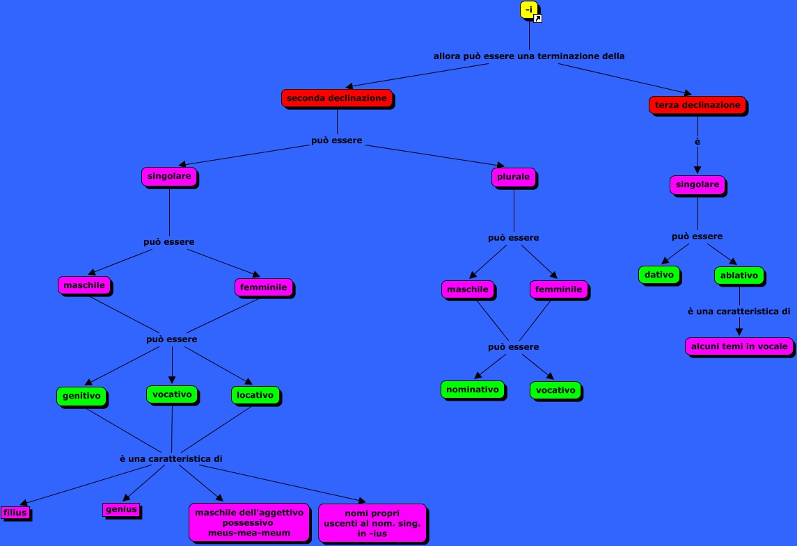 Terminazione -i, maschile può essere vocativo, singolare può essere ablativo, vocativo è una caratteristica di genius, terza declinazione è singolare, vocativo è una caratteristica di nomi propri uscenti al nom. sing. in -ius, maschile può essere genitivo, genitivo è una caratteristica di genius, -i allora può essere una terminazione della seconda declinazione, plurale può essere maschile, maschile può essere locativo