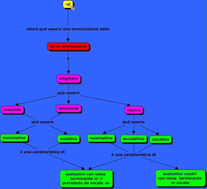 Terminazione -al, nominativo è una caratteristica di sostantivi neutri con tema terminante in vocale, maschile può essere vocativo, accusativo è una caratteristica di sostantivi neutri con tema terminante in vocale, accusativo è una caratteristica di sostantivi con tema terminante in -l preceduto da vocale -a-, vocativo è una caratteristica di sostantivi neutri con tema terminante in vocale, maschile può essere nominativo, singolare può essere maschile, neutro può essere accusativo, terza declinazione è singolare, nominativo è una caratteristica di sostantivi con tema terminante in -l preceduto da vocale -a-