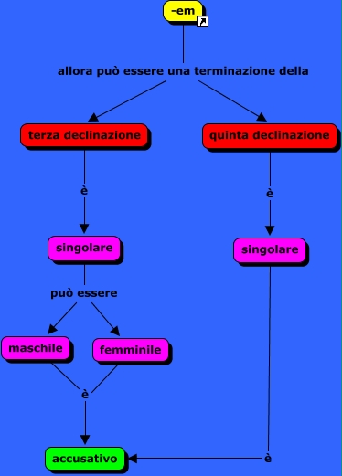 Terminazione -em, maschile è accusativo, quinta declinazione è singolare, terza declinazione è singolare, -em allora può essere una terminazione della terza declinazione, singolare è accusativo, singolare può essere maschile, femminile è accusativo, singolare può essere femminile, -em allora può essere una terminazione della quinta declinazione