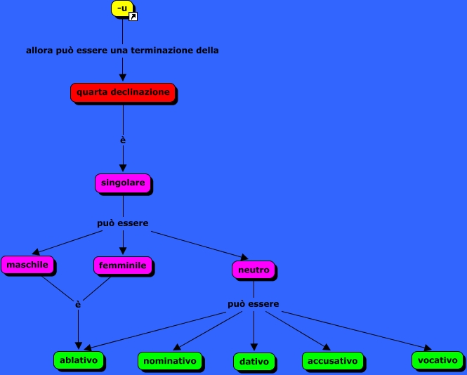 Terminazione -u, singolare può essere femminile, neutro può essere accusativo, neutro può essere ablativo, -u allora può essere una terminazione della quarta declinazione, maschile è ablativo, neutro può essere vocativo, quarta declinazione è singolare, singolare può essere maschile, neutro può essere nominativo, femminile è ablativo