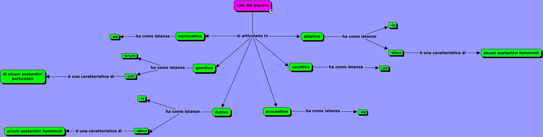 Casi della prima declinazione - Terminazioni del plurale, nominativo ha come istanza -ae, dativo ha come istanze -abus, accusativo ha come istanza -as, casi del plurale si articolano in genitivo, vocativo ha come istanza -ae, casi del plurale si articolano in nominativo, -um è una caratteristica di di alcuni sostantivi particolari, casi del plurale si articolano in accusativo, genitivo ha come istanza -arum, ablativo ha come istanze -is
