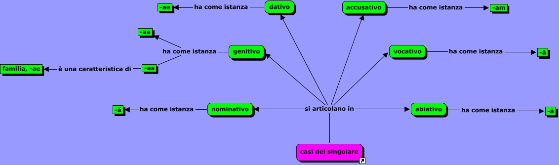 Casi della prima declinazione - Terminazioni del singolare, casi del singolare si articolano in genitivo, casi del singolare si articolano in ablativo, nominativo ha come istanza -ă, accusativo ha come istanza -am, ablativo ha come istanza -ā, casi del singolare si articolano in dativo, genitivo ha come istanza -ae, casi del singolare si articolano in accusativo, genitivo ha come istanza -as, -as è una caratteristica di familia, -ae