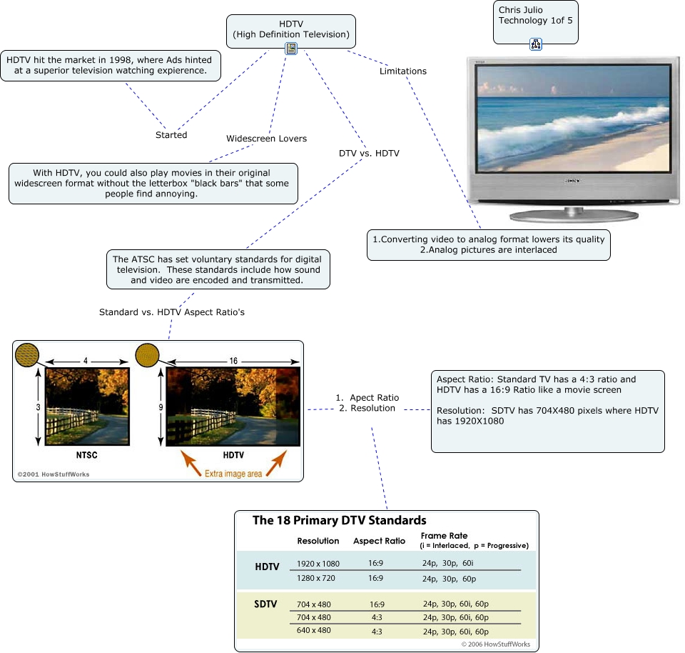 technology 1, 1.Converting video to analog format lowers its quality 2.Analog pictures are interlaced Limitations HDTV (High Definition Television), With HDTV, you could also play movies in their original widescreen format without the letterbox "black bars" that some people find annoying. Widescreen Lovers HDTV (High Definition Television), 1. Apect Ratio 2. Resolution , Standard vs. HDTV Aspect Ratio's The ATSC has set voluntary standards for digital television. These standards include how sound and video are encoded and transmitted., Aspect Ratio: Standard TV has a 4:3 ratio and HDTV has a 16:9 Ratio like a movie screen Resolution: SDTV has 704X480 pixels where HDTV has 1920X1080 1. Apect Ratio 2. Resolution , HDTV hit the market in 1998, where Ads hinted at a superior television watching expierence. Started HDTV (High Definition Television), The ATSC has set voluntary standards for digital television. These standards include how sound and video are encoded and transmitted. DTV vs. HDTV HDTV (High Definition Television)