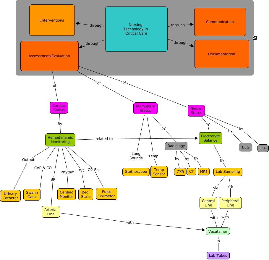 Nsg Technology for Global Team, Hemodynamic Monitoring O2 Sat Pulse Oximeter, Lab Sampling via Central Line, Neuro Status by EEG, Pulmonary Status Lung Sounds Stethoscope, Nursing Technology in Critical Care through Interventions, Pulmonary Status Temp Temp Sensor, Radiology by CT, Hemodynamic Monitoring Output Urinary Catheter, Pulmonary Status by Radiology, Central Line with Vacutainer