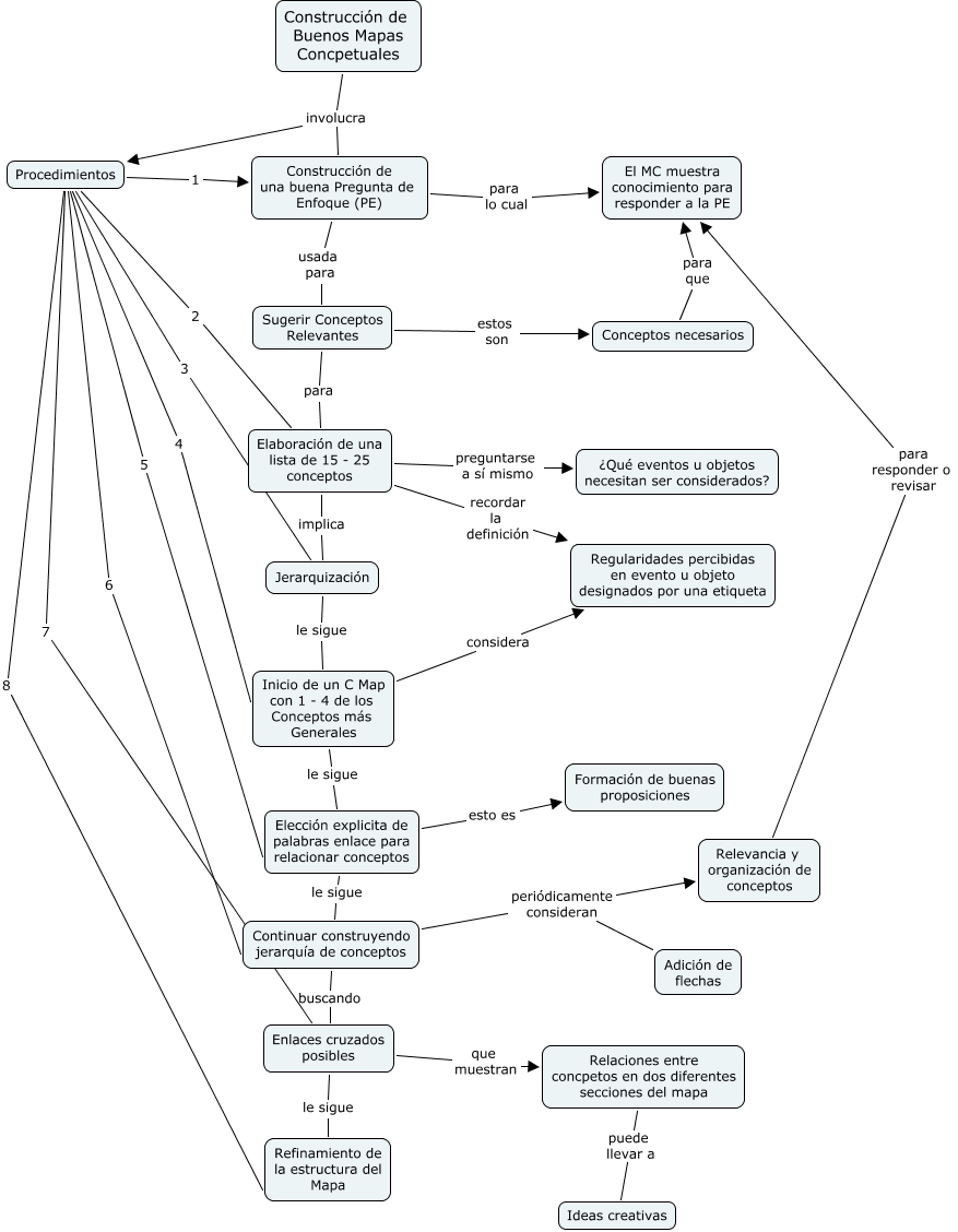 Elaborar buen CMap, Procedimientos 3 Jerarquización, Enlaces cruzados posibles que muestran Relaciones entre concpetos en dos diferentes secciones del mapa, Procedimientos 1 Construcción de una buena Pregunta de Enfoque (PE), Inicio de un C Map con 1 - 4 de los Conceptos más Generales le sigue Elección explicita de palabras enlace para relacionar conceptos, Continuar construyendo jerarquía de conceptos buscando Enlaces cruzados posibles, Continuar construyendo jerarquía de conceptos periódicamente consideran Adición de flechas, Relevancia y organización de conceptos para responder o revisar El MC muestra conocimiento para responder a la PE, Procedimientos 4 Inicio de un C Map con 1 - 4 de los Conceptos más Generales, Procedimientos 8 Refinamiento de la estructura del Mapa, Sugerir Conceptos Relevantes estos son Conceptos necesarios