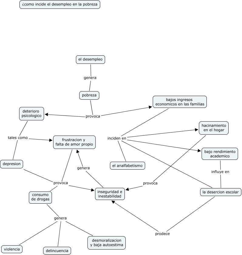 la pobreza, frustracion y falta de amor propio provoca inseguridad e inestabilidad, frustracion y falta de amor propio provoca consumo de drogas, bajos ingresos economicos en las familias inciden en bajo rendimiento academico, consumo de drogas genera violencia, hacinamiento en el hogar provoca inseguridad e inestabilidad, bajo rendimiento academico influye en la desercion escolar, bajos ingresos economicos en las familias inciden en la desercion escolar, depresion provoca consumo de drogas, el desempleo genera pobreza, deterioro psicologico tales como depresion