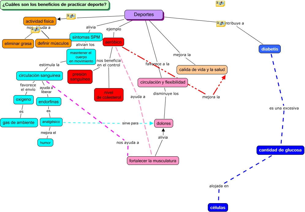 Deportes, masntener el cuerpo en movimiento estimula la circulación sanguínea, aeróbico nos beneficia en el control nivel de colesterol, Deportes contribuye a diabetis, Deportes es actividad física, circulación y flexibilidad disminuye los dolores, oxígeno es gas de ambiente, cantidad de glucosa alojada en células, diabetis es una excesiva cantidad de glucosa, circulación sanguínea nos ayuda a fortalecer la musculatura, actividad física nos ayuda a definir músculos