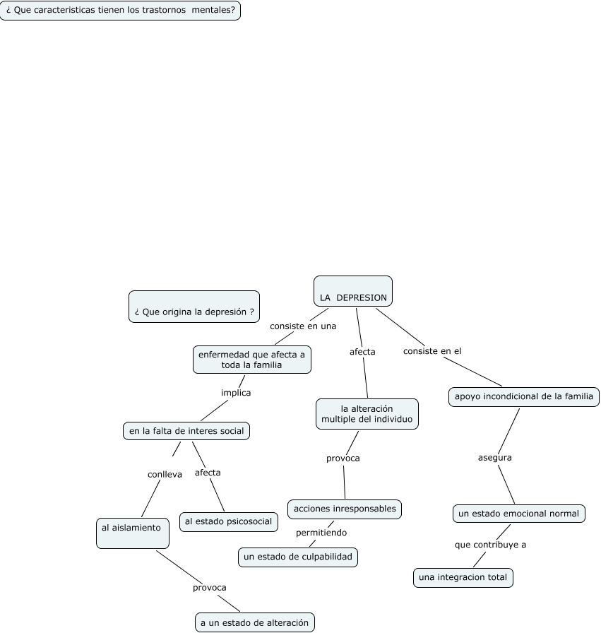 depresion gla, LA DEPRESION consiste en el apoyo incondicional de la familia, en la falta de interes social afecta al estado psicosocial, apoyo incondicional de la familia asegura un estado emocional normal, enfermedad que afecta a toda la familia implica en la falta de interes social, un estado emocional normal que contribuye a una integracion total, LA DEPRESION afecta la alteración multiple del individuo, LA DEPRESION consiste en una enfermedad que afecta a toda la familia, la alteración multiple del individuo provoca acciones inresponsables, acciones inresponsables permitiendo un estado de culpabilidad, al aislamiento provoca a un estado de alteración