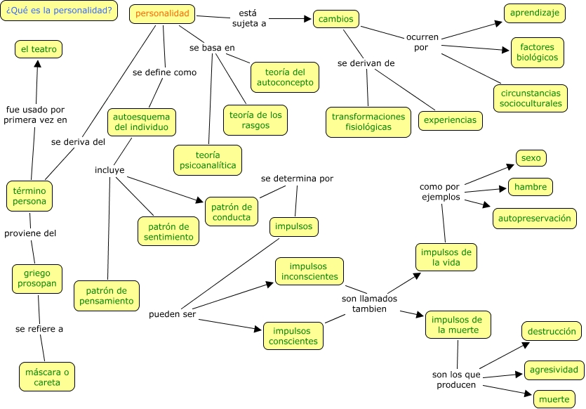 personalidad, impulsos de la muerte son los que producen agresividad, impulsos conscientes son llamados tambien impulsos de la muerte, personalidad se define como autoesquema del individuo, autoesquema del individuo incluye patrón de pensamiento, cambios ocurren por circunstancias socioculturales, impulsos conscientes son llamados tambien impulsos de la vida, impulsos de la muerte son los que producen destrucción, impulsos de la vida como por ejemplos sexo, impulsos inconscientes son llamados tambien impulsos de la muerte, impulsos pueden ser impulsos inconscientes