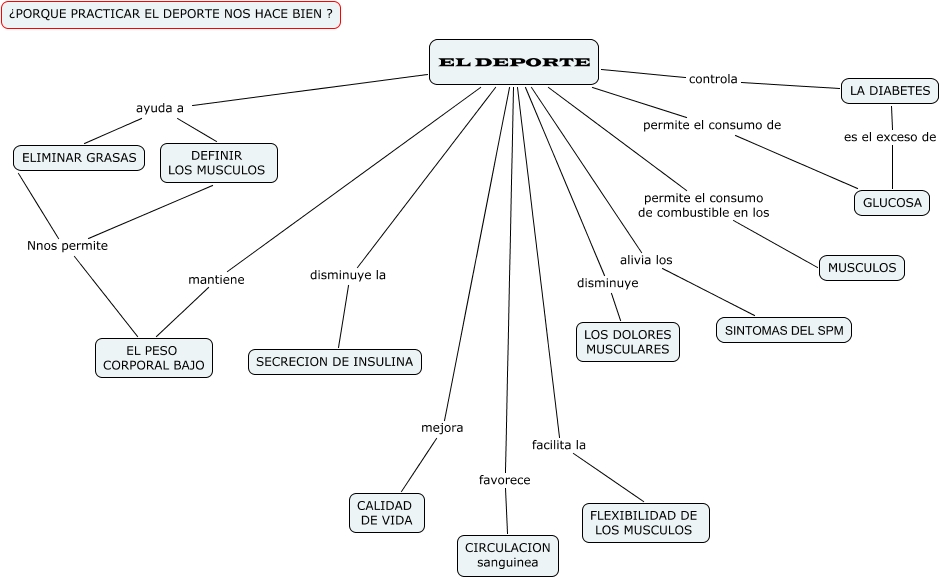 EL DEPORTE, EL DEPORTE ayuda a ELIMINAR GRASAS, EL DEPORTE favorece CIRCULACION sanguinea, EL DEPORTE disminuye LOS DOLORES MUSCULARES, LA DIABETES es el exceso de GLUCOSA, EL DEPORTE disminuye la SECRECION DE INSULINA, EL DEPORTE mejora CALIDAD DE VIDA, EL DEPORTE alivia los SINTOMAS DEL SPM, EL DEPORTE ayuda a DEFINIR LOS MUSCULOS, EL DEPORTE facilita la FLEXIBILIDAD DE LOS MUSCULOS, EL DEPORTE permite el consumo de combustible en los MUSCULOS