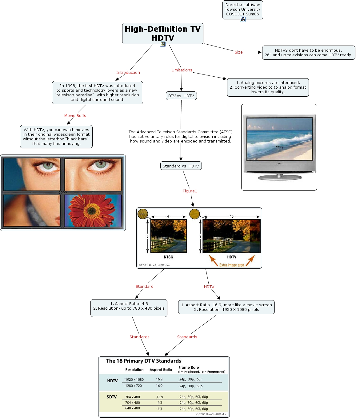 HDTV Cmap, High-Definition TV HDTV Limitations 1. Analog pictures are interlaced. 2. Converting video to to analog format lowers its quality., In 1998, the first HDTV was introduced to sports and technology lovers as a new "televison paradise" with higher resolution and digital surround sound. Movie Buffs With HDTV, you can watch movies in their original widescreen format without the letterbox "black bars" that many find annoying., High-Definition TV HDTV Size HDTVS dont have to be enormous. 26" and up televisions can come HDTV ready., DTV vs. HDTV The Advanced Televison Standards Committee (ATSC) has set voluntary rules for digital television including how sound and video are encoded and transmitted. Standard vs. HDTV, 1. Aspect Ratio- 4.3 2. Resolution- up to 780 X 480 pixels Standards , Standard 1. Aspect Ratio- 4.3 2. Resolution- up to 780 X 480 pixels, 1. Aspect Ratio- 16.9; more like a movie screen 2. Resolution- 1920 X 1080 pixels Standards , High-Definition TV HDTV Limitations DTV vs. HDTV, High-Definition TV HDTV Introduction In 1998, the first HDTV was introduced to sports and technology lovers as a new "televison paradise" with higher resolution and digital surround sound., HDTV 1. Aspect Ratio- 16.9; more like a movie screen 2. Resolution- 1920 X 1080 pixels