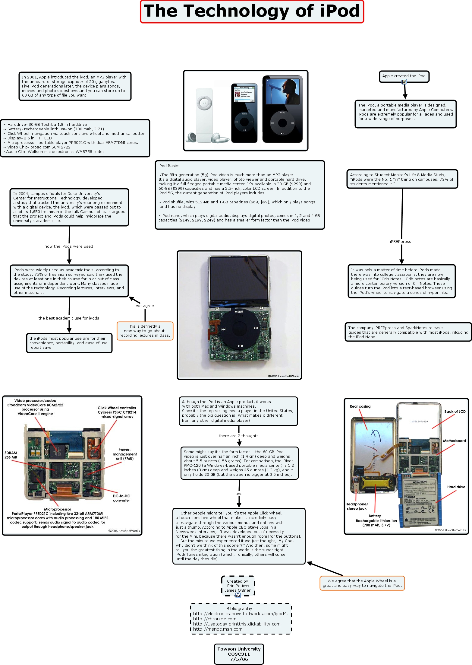 report1, This is definetly a new way to go about recording lectures in class. we agree iPods were widely used as academic tools, according to the study: 75% of freshman surveyed said they used the devices at least one in their course for in or out of class assignments or independent work. Many classes made use of the technology. Recording lectures, interviews, and other materials., iPods were widely used as academic tools, according to the study: 75% of freshman surveyed said they used the devices at least one in their course for in or out of class assignments or independent work. Many classes made use of the technology. Recording lectures, interviews, and other materials. the best academic use for iPods the iPods most popular use are for their convenience, portability, and ease of use report says., We agree that the Apple Wheel is a great and easy way to navigate the iPod. ???? Other people might tell you it's the Apple Click Wheel, a touch-sensitive wheel that makes it incredibly easy to navigate through the various menus and options with just a thumb. According to Apple CEO Steve Jobs in a Newsweek interview, "It was developed out of necessity for the Mini, because there wasn't enough room [for the buttons]. But the minute we experienced it we just thought, 'My God, why didn't we think of this sooner?'" And then, some might tell you the greatest thing in the world is the super-tight iPod/iTunes integration (which, ironically, others will curse until the day they die)., Some might say it's the form factor -- the 60-GB iPod video is just over half an inch (1.4 cm) deep and weighs about 5.5 ounces (156 grams). For comparison, the iRiver PMC-120 (a Windows-based portable media center) is 1.2 inches (3 cm) deep and weighs 45 ounces (1.3 kg), and it only holds 20 GB (but the screen is bigger at 3.5 inches). and Other people might tell you it's the Apple Click Wheel, a touch-sensitive wheel that makes it incredibly easy to navigate through the various menus and options with just a thumb. According to Apple CEO Steve Jobs in a Newsweek interview, "It was developed out of necessity for the Mini, because there wasn't enough room [for the buttons]. But the minute we experienced it we just thought, 'My God, why didn't we think of this sooner?'" And then, some might tell you the greatest thing in the world is the super-tight iPod/iTunes integration (which, ironically, others will curse until the day they die)., According to Student Monitor's Life & Media Study, "iPods were the No. 1 "in" thing on campuses; 73% of students mentioned it." iPREPpress: It was only a matter of time before iPods made there way into college classrooms, they are now being used for "Crib Notes." Crib notes are basically a more contemporary version of CliffNotes. These guides turn the iPod into a text-based browser using the iPod's wheel to navigate a series of hyperlinks., In 2004, campus officials for Duke University's Center for Instructional Technology, developed a study that tracked the university's yearlong experiment with a digital device, the iPod, which were passed out to all of its 1,650 freshman in the fall. Campus officials argued that the project and iPods could help invigorate the university's academic life. how the iPods were used iPods were widely used as academic tools, according to the study: 75% of freshman surveyed said they used the devices at least one in their course for in or out of class assignments or independent work. Many classes made use of the technology. Recording lectures, interviews, and other materials., Apple created the iPod The iPod, a portable media player is designed, marketed and manufactured by Apple Computers. iPods are extremely popular for all ages and used for a wide range of purposes., Although the iPod is an Apple product, it works with both Mac and Windows machines. Since it's the top-selling media player in the United States, probably the big question is: What makes it different from any other digital media player? there are 2 thoughts Some might say it's the form factor -- the 60-GB iPod video is just over half an inch (1.4 cm) deep and weighs about 5.5 ounces (156 grams). For comparison, the iRiver PMC-120 (a Windows-based portable media center) is 1.2 inches (3 cm) deep and weighs 45 ounces (1.3 kg), and it only holds 20 GB (but the screen is bigger at 3.5 inches).