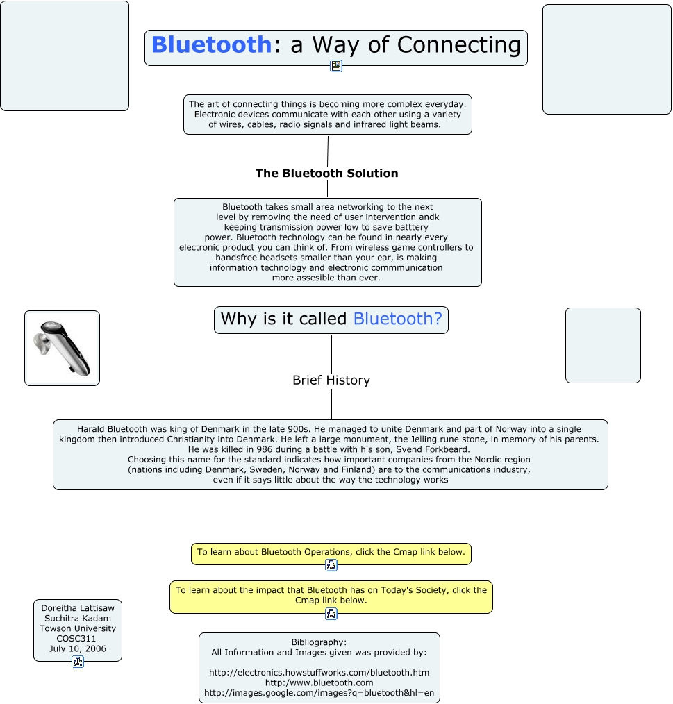 Bluetooth, The art of connecting things is becoming more complex everyday. Electronic devices communicate with each other using a variety of wires, cables, radio signals and infrared light beams. The Bluetooth Solution Bluetooth takes small area networking to the next level by removing the need of user intervention andk keeping transmission power low to save batttery power. Bluetooth technology can be found in nearly every electronic product you can think of. From wireless game controllers to handsfree headsets smaller than your ear, is making information technology and electronic commmunication more assesible than ever., Why is it called Bluetooth? Brief History Harald Bluetooth was king of Denmark in the late 900s. He managed to unite Denmark and part of Norway into a single kingdom then introduced Christianity into Denmark. He left a large monument, the Jelling rune stone, in memory of his parents. He was killed in 986 during a battle with his son, Svend Forkbeard. Choosing this name for the standard indicates how important companies from the Nordic region (nations including Denmark, Sweden, Norway and Finland) are to the communications industry, even if it says little about the way the technology works