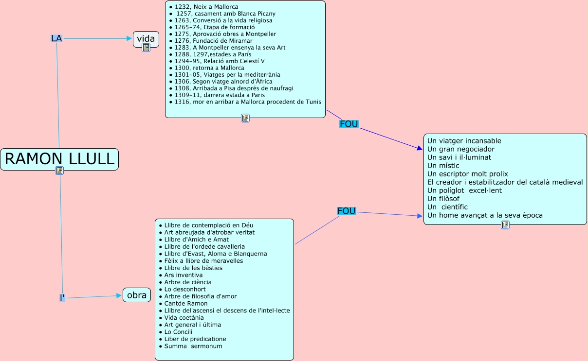 arrosegar, RAMON LLULL l' obra, RAMON LLULL LA vida, ∙ Llibre de contemplació en Déu ∙ Art abreujada d'atrobar veritat ∙ Llibre d'Amich e Amat ∙ Llibre de l'ordede cavalleria ∙ Llibre d'Evast, Aloma e Blanquerna ∙ Fèlix a llibre de meravelles ∙ Llibre de les bèsties ∙ Ars inventiva ∙ Arbre de ciència ∙ Lo desconhort ∙ Arbre de filosofia d'amor ∙ Cantde Ramon ∙ Llibre del'ascensi el descens de l'intel·lecte ∙ Vida coetània ∙ Art general i última ∙ Lo Concili ∙ Liber de predicatione ∙ Summa sermonum FOU Un viatger incansable Un gran negociador Un savi i il·luminat Un místic Un escriptor molt prolix El creador i estabilitzador del català medieval Un políglot excel·lent Un filòsof Un científic Un home avançat a la seva època, ∙ 1232, Neix a Mallorca ∙ 1257, casament amb Blanca Picany ∙ 1263, Conversió a la vida religiosa ∙ 1265-74, Etapa de formació ∙ 1275, Aprovació obres a Montpeller ∙ 1276, Fundació de Miramar ∙ 1283, A Montpeller ensenya la seva Art ∙ 1288, 1297,estades a París ∙ 1294-95, Relació amb Celestí V ∙ 1300, retorna a Mallorca ∙ 1301-05, Viatges per la mediterrània ∙ 1306, Segon viatge alnord d'Àfrica ∙ 1308, Arribada a Pisa després de naufragi ∙ 1309-11, darrera estada a Paris ∙ 1316, mor en arribar a Mallorca procedent de Tunis FOU Un viatger incansable Un gran negociador Un savi i il·luminat Un místic Un escriptor molt prolix El creador i estabilitzador del català medieval Un políglot excel·lent Un filòsof Un científic Un home avançat a la seva època
