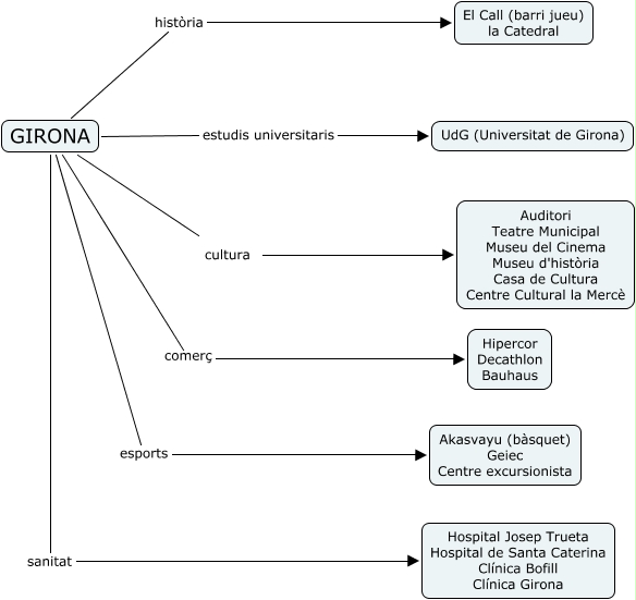 Girona, GIRONA cultura Auditori Teatre Municipal Museu del Cinema Museu d'història Casa de Cultura Centre Cultural la Mercè, GIRONA història El Call (barri jueu) la Catedral, GIRONA sanitat Hospital Josep Trueta Hospital de Santa Caterina Clínica Bofill Clínica Girona, GIRONA estudis universitaris UdG (Universitat de Girona), GIRONA comerç Hipercor Decathlon Bauhaus, GIRONA esports Akasvayu (bàsquet) Geiec Centre excursionista
