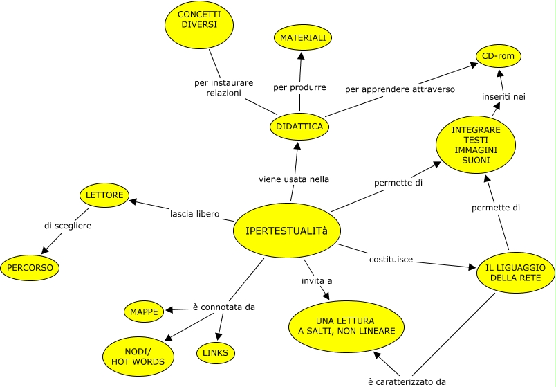 ipertestualità, IPERTESTUALITà costituisce IL LIGUAGGIO DELLA RETE, DIDATTICA per produrre MATERIALI, IPERTESTUALITà è connotata da LINKS, IL LIGUAGGIO DELLA RETE permette di INTEGRARE TESTI IMMAGINI SUONI, IPERTESTUALITà lascia libero LETTORE, LETTORE di scegliere PERCORSO, INTEGRARE TESTI IMMAGINI SUONI inseriti nei CD-rom, IPERTESTUALITà invita a UNA LETTURA A SALTI, NON LINEARE, IL LIGUAGGIO DELLA RETE è caratterizzato da UNA LETTURA A SALTI, NON LINEARE, IPERTESTUALITà è connotata da NODI/ HOT WORDS