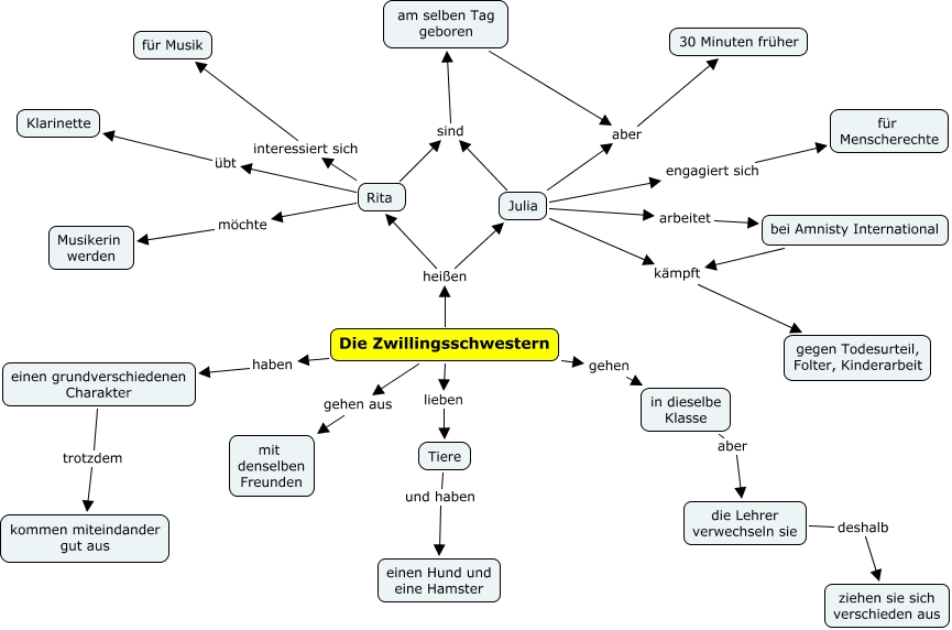 zwlingschwestern (claudio Santi), Die Zwillingsschwestern heißen Rita, Rita übt Klarinette, am selben Tag geboren aber 30 Minuten früher, Julia arbeitet bei Amnisty International, Die Zwillingsschwestern gehen in dieselbe Klasse, Tiere und haben einen Hund und eine Hamster, Rita möchte Musikerin werden, einen grundverschiedenen Charakter trotzdem kommen miteindander gut aus, die Lehrer verwechseln sie deshalb ziehen sie sich verschieden aus, Julia engagiert sich für Menscherechte