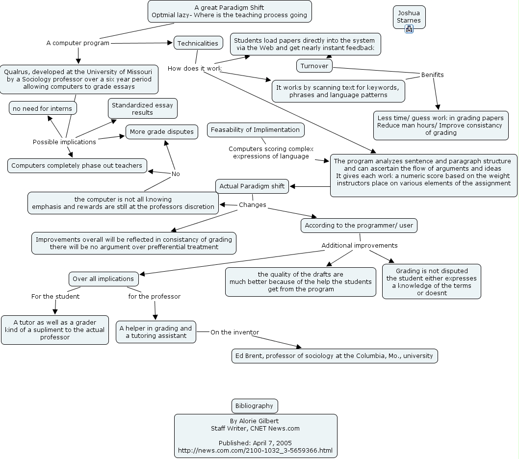 Report 1 Paradigm Shift, Over all implications for the professor A helper in grading and a tutoring assistant, Technicalities How does it work It works by scanning text for keywords, phrases and language patterns, Actual Paradigm shift Changes the computer is not all knowing emphasis and rewards are still at the professors discretion, Qualrus, developed at the University of Missouri by a Sociology professor over a six year period allowing computers to grade essays Possible implications no need for interns, A great Paradigm Shift Optmial lazy- Where is the teaching process going A computer program Technicalities, Over all implications For the student A tutor as well as a grader kind of a supliment to the actual professor, Actual Paradigm shift Changes According to the programmer/ user, Qualrus, developed at the University of Missouri by a Sociology professor over a six year period allowing computers to grade essays Possible implications More grade disputes, Actual Paradigm shift Changes Improvements overall will be reflected in consistancy of grading there will be no argument over prefferential treatment, According to the programmer/ user Additional improvements the quality of the drafts are much better because of the help the students get from the program
