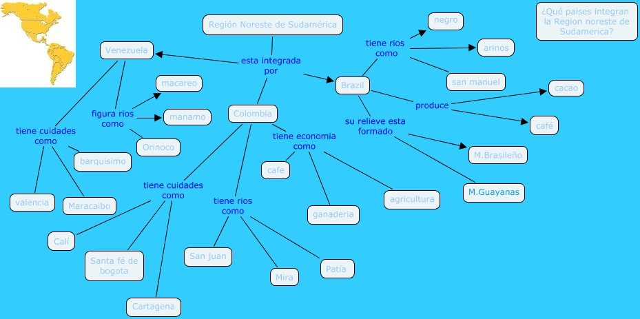REGION NOROESTE DE SUDAMERICA, Colombia tiene rios como San juan, Región Noreste de Sudamérica esta integrada por Brazil, Venezuela figura rios como manamo, Brazil tiene rios como san manuel, Colombia tiene rios como Patía, Brazil su relieve esta formado M.Brasileño, Región Noreste de Sudamérica esta integrada por Colombia, Venezuela tiene cuidades como valencia, Colombia tiene cuidades como Santa fé de bogota, Colombia tiene economia como cafe