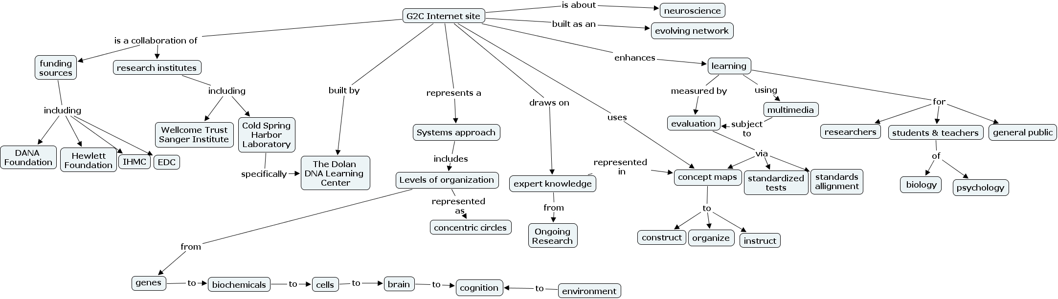 G2C Internet site draws on expert knowledge, G2C Internet site uses concept maps, Systems approach includes Levels of organization, G2C Internet site is a collaboration of research institutes, G2C Internet site is a collaboration of funding sources, research institutes including Wellcome Trust Sanger Institute, research institutes including Cold Spring Harbor Laboratory, Levels of organization from genes, expert knowledge from Ongoing Research, learning for researchers, learning for general public, learning for students & teachers, learning measured by evaluation, genes to biochemicals, evaluation via standardized tests, evaluation via concept maps, evaluation via standards allignment, G2C Internet site built by The Dolan DNA Learning Center, expert knowledge represented in concept maps, cells to brain, G2C Internet site built as an evolving network, environment to cognition, brain to cognition, G2C Internet site represents a Systems approach, biochemicals to cells, Cold Spring Harbor Laboratory specifically The Dolan DNA Learning Center, students & teachers of biology, students & teachers of psychology, G2C Internet site is about neuroscience, learning using multimedia, Levels of organization represented as concentric circles, concept maps to instruct, concept maps to organize, concept maps to construct, funding sources including Hewlett Foundation, funding sources including EDC, funding sources including DANA Foundation, funding sources including IHMC, G2C Internet site enhances learning, multimedia subject to evaluation